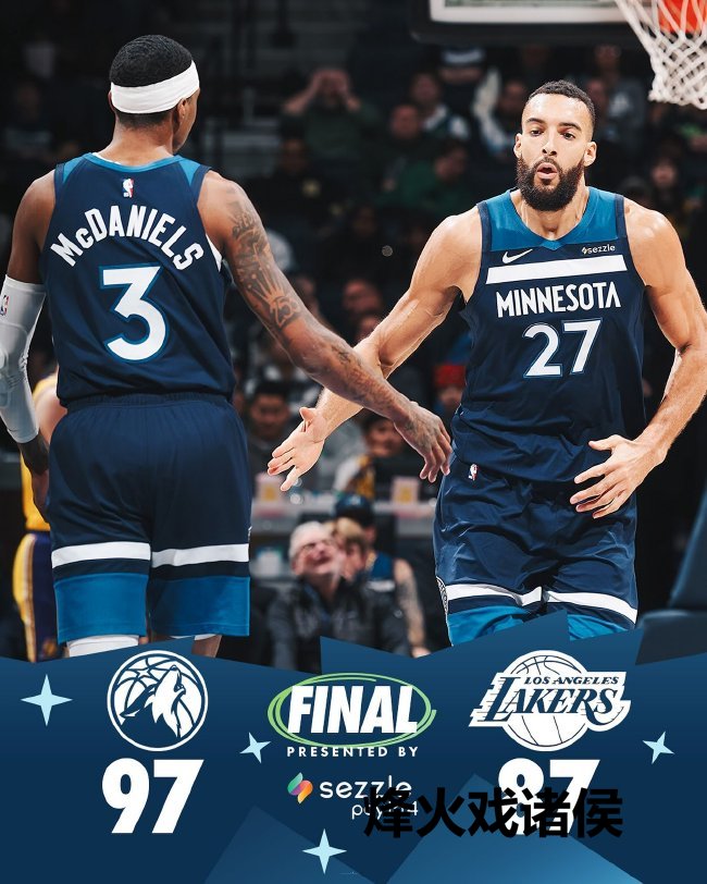 丛林狼(13-11):爱德华兹23分6篮板、兰德尔21分5篮板3助攻、麦克丹尼尔斯18分9篮板5抢断、戈贝尔12分13篮板、里德10分5篮板
